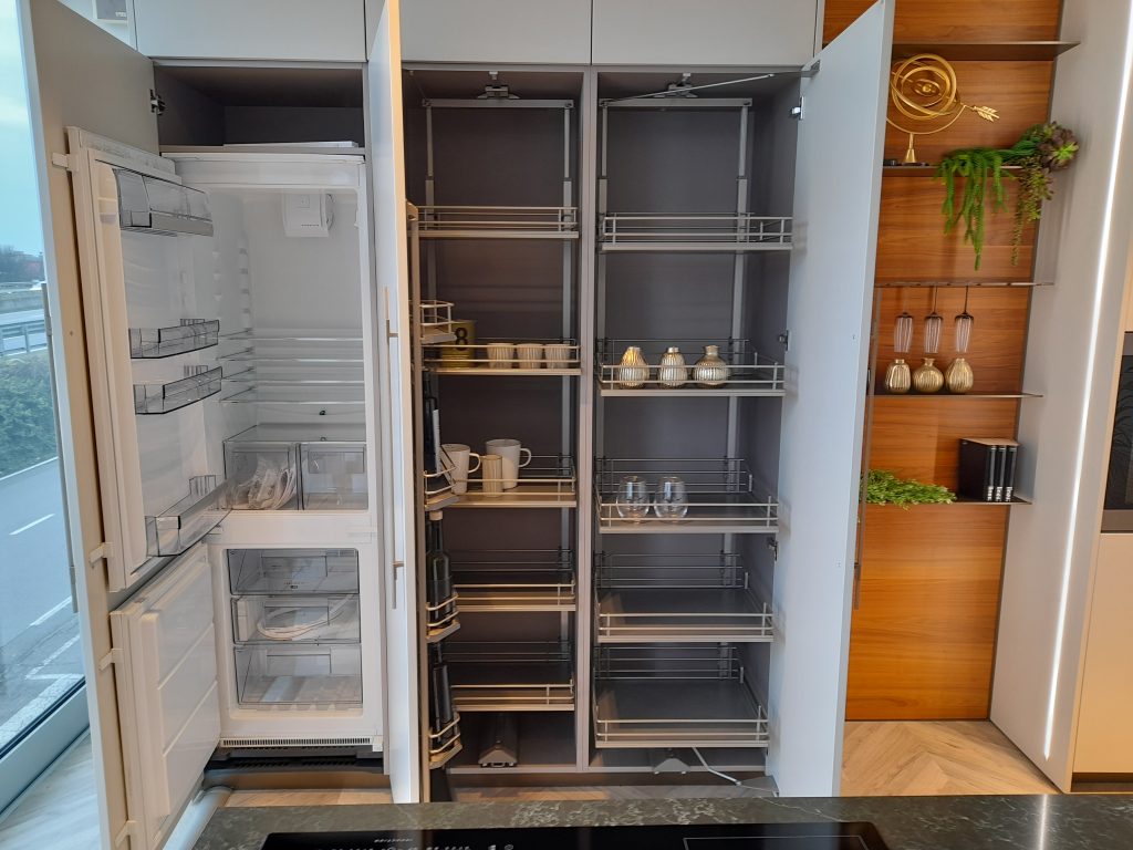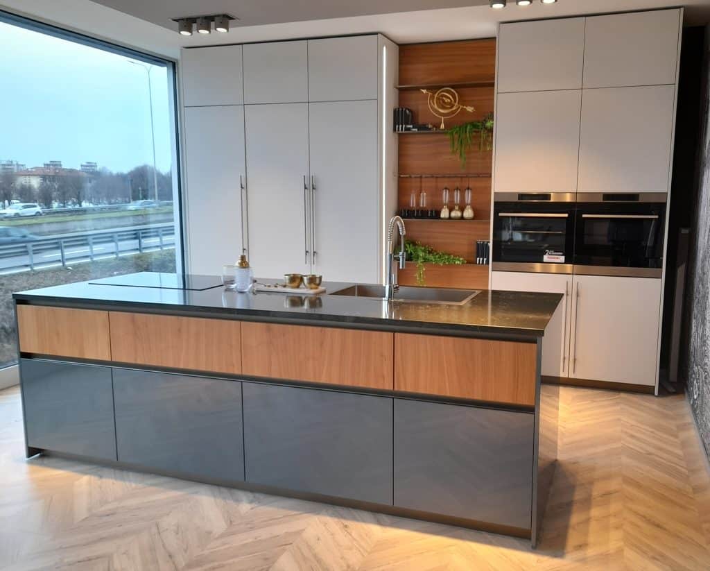 Cucina mod. NATURAL in laccato lucido, opaco e noce, prodotta da Stosa Cucine, composizione isola per cm 275 x 99, colonne cm 124 (3 colonne a sx) 90 cm (vano a giorno centrale) e cm 99 (2 colonne a dx)